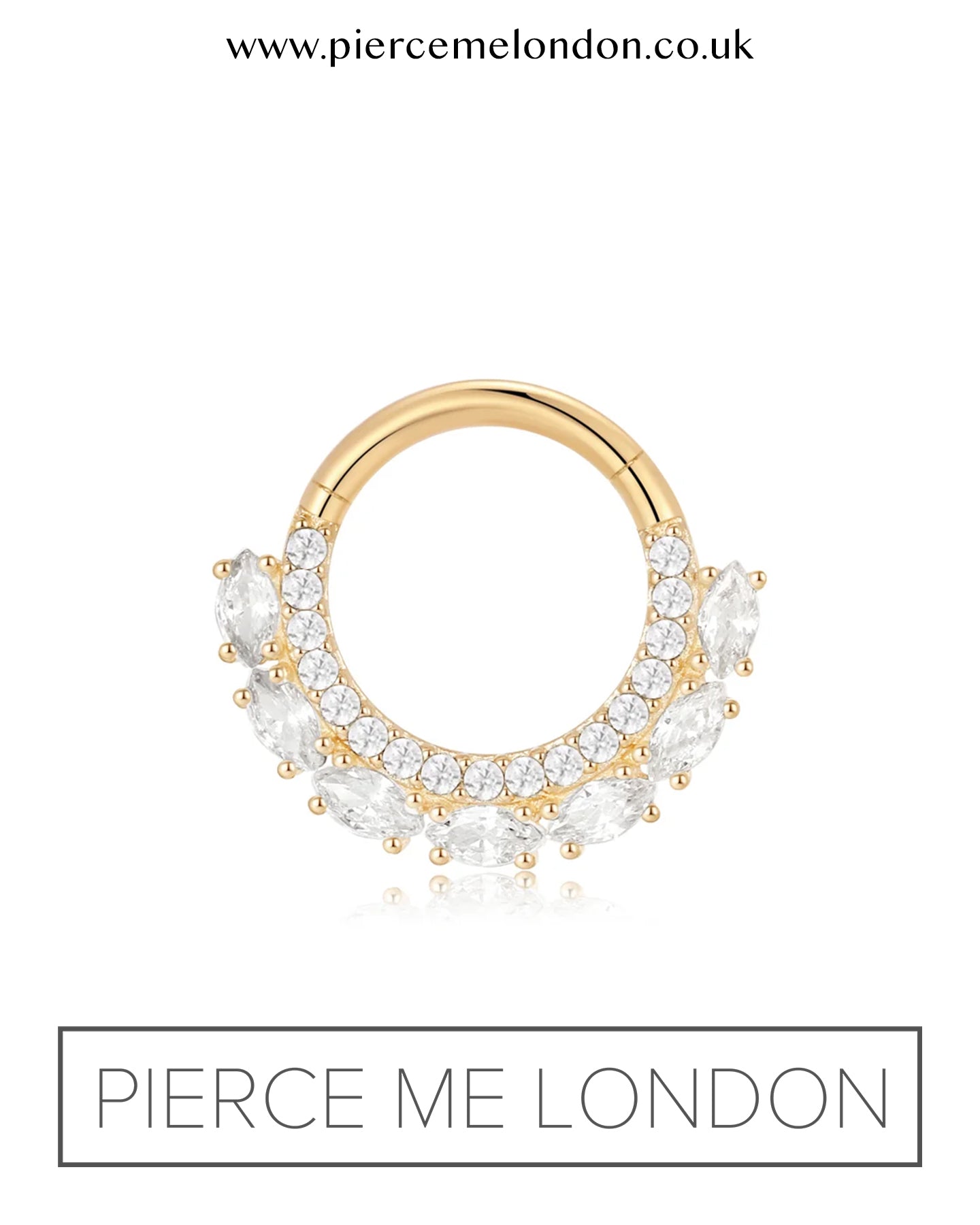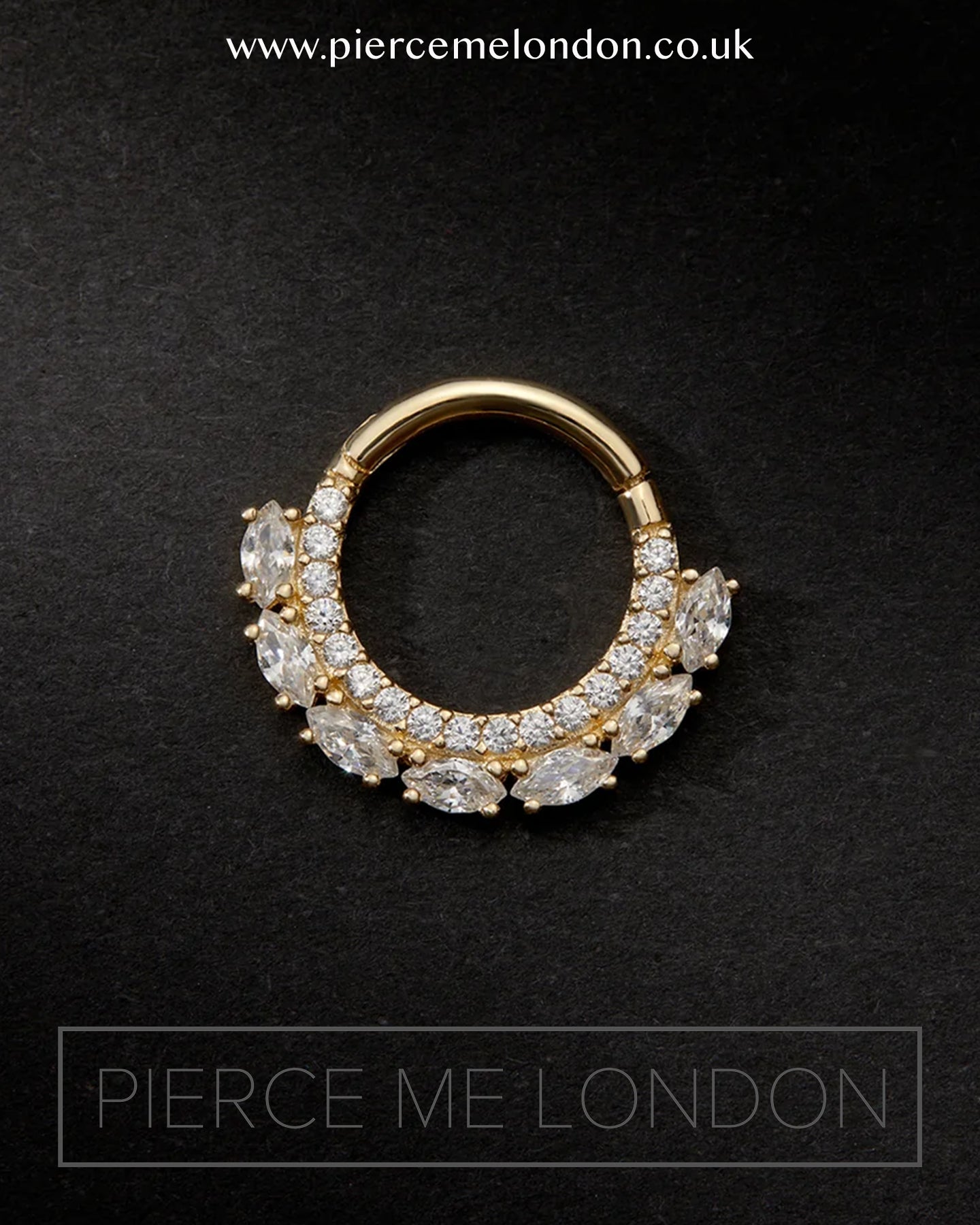 Gold clicker featuring a row of shimmering pave clear CZ's that are framed by larger marquise stones (1.0mm Round CZ's & 1.5mm x 3mm Marquise CZ's)